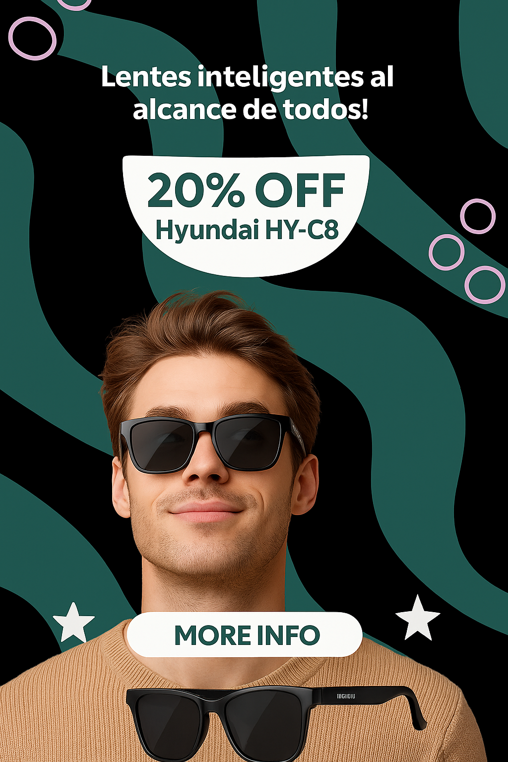Las Hyundai HY-C8 combinan estilo urbano y tecnología avanzada para quienes buscan funcionalidad sin renunciar al diseño. Estas gafas inteligentes de audio e inteligencia artificial te acompañan en tu día a día conectando con tu entorno sin cables ni distracciones.